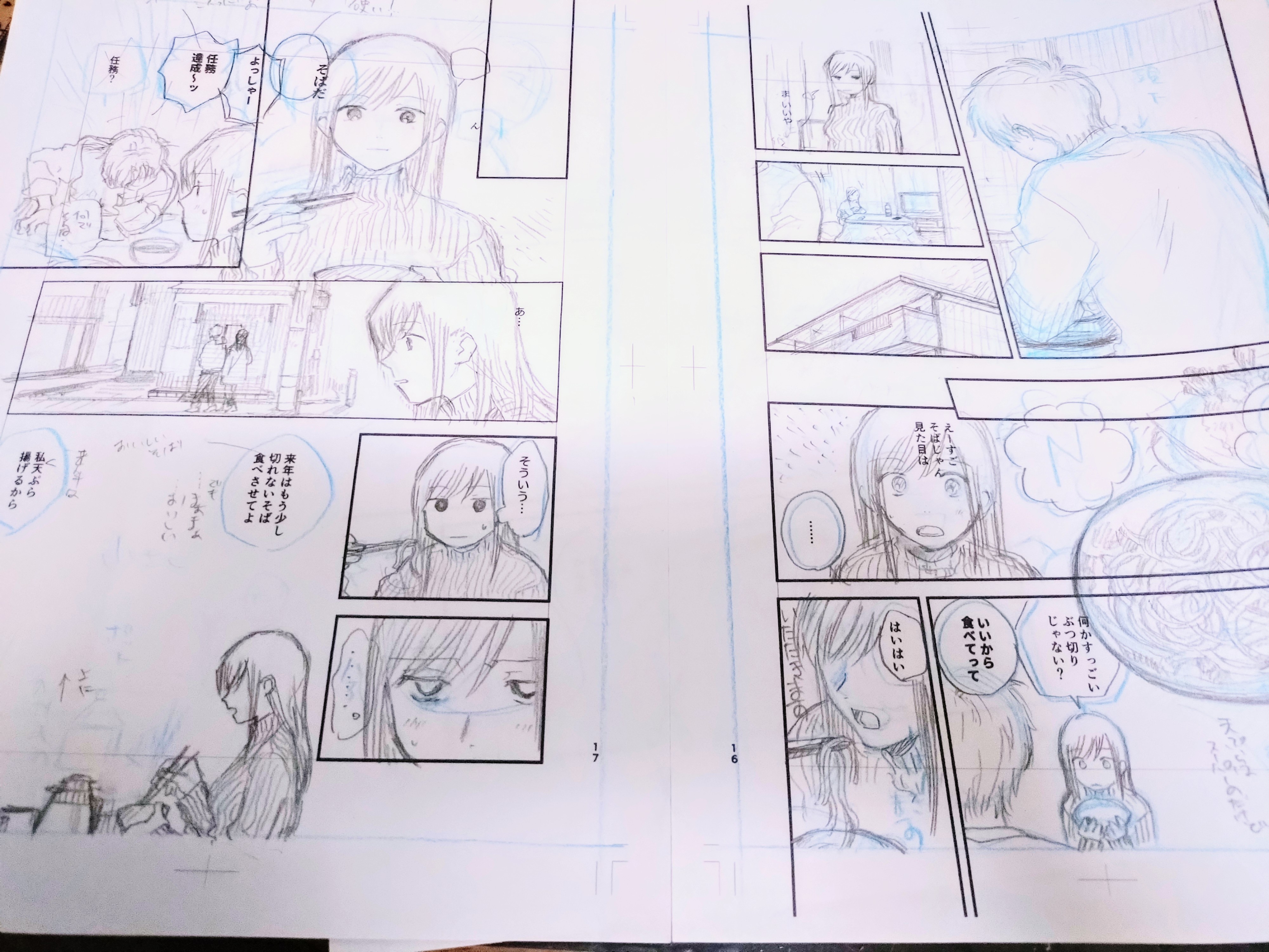 前回A5見開きアナログで下描きするのが早く感じたので、今回はA5とB5の中間くらいのサイズで見開き単位で描き始めました。